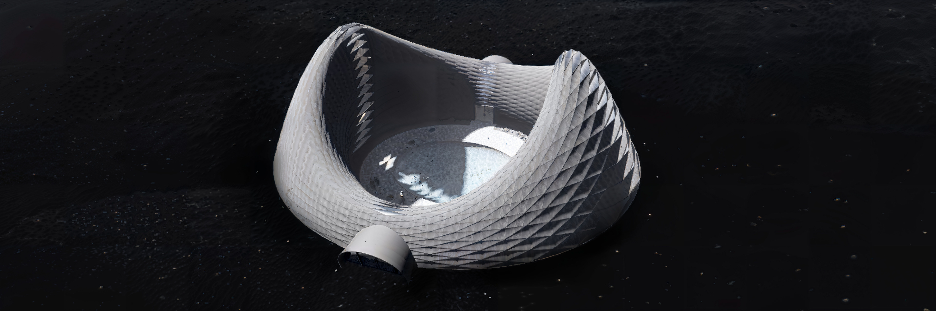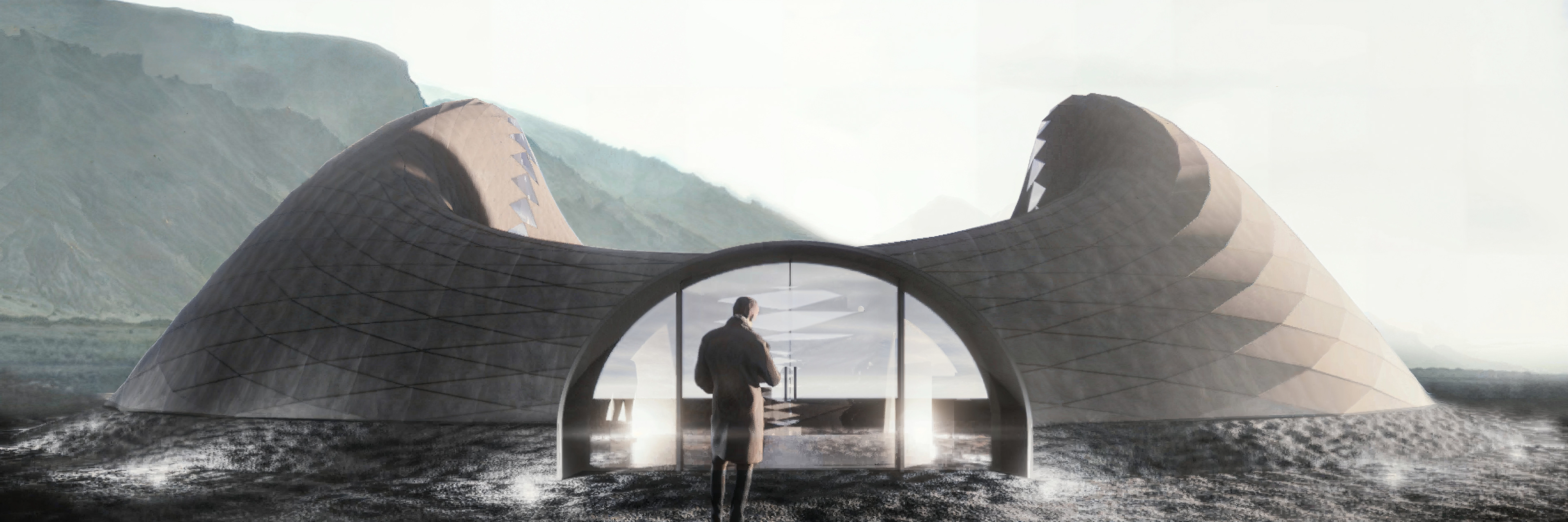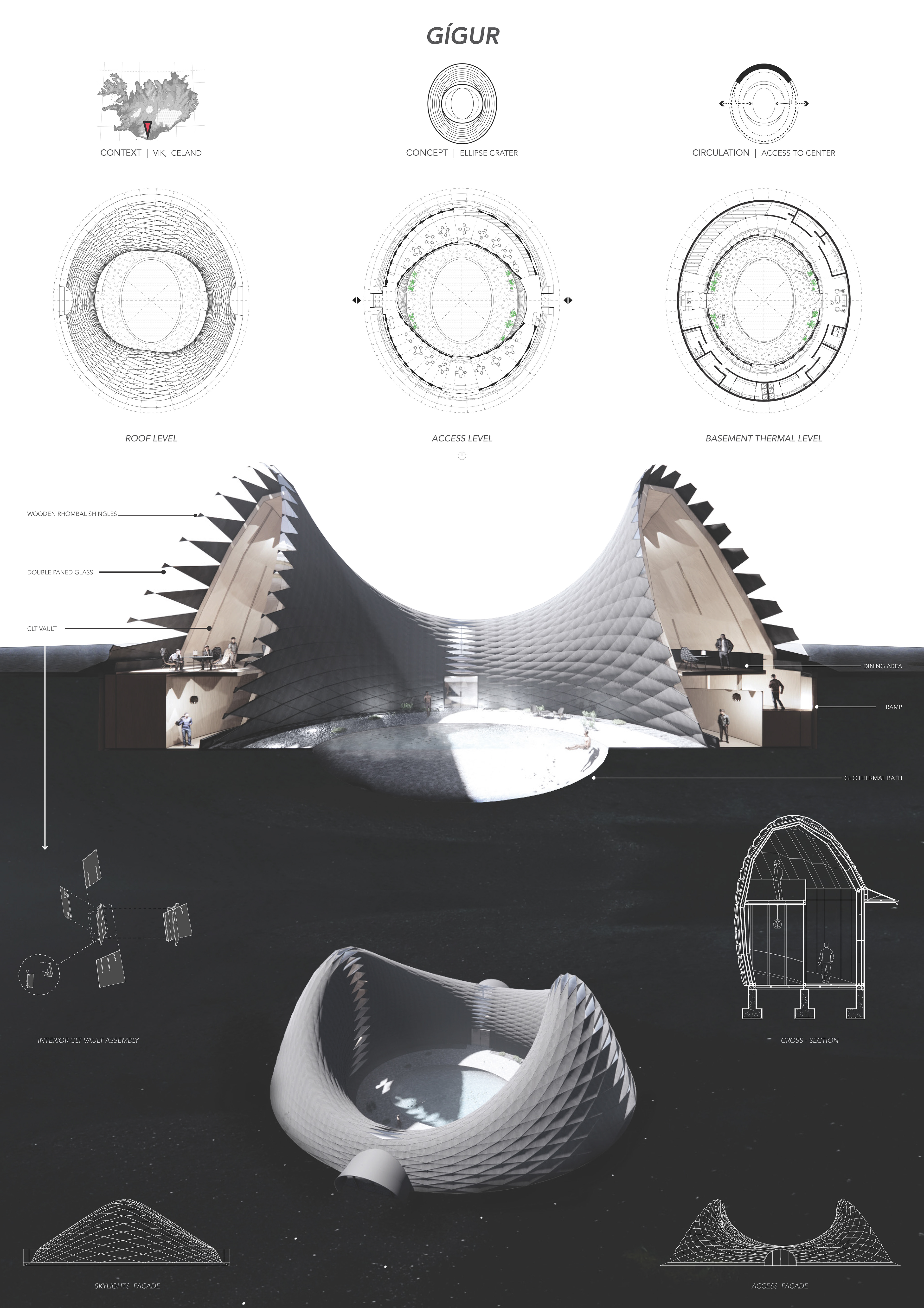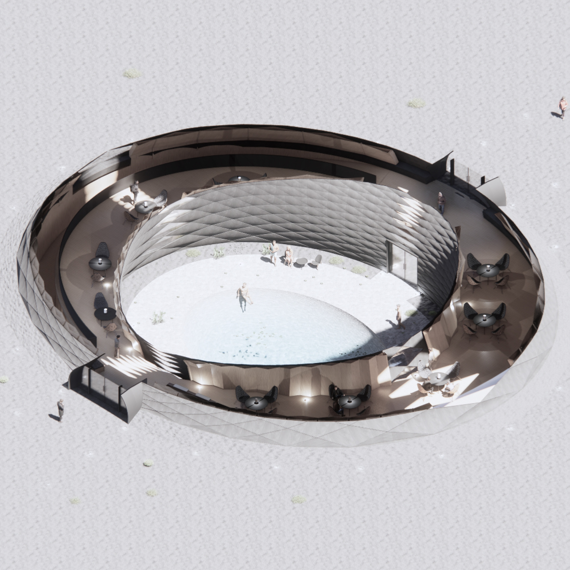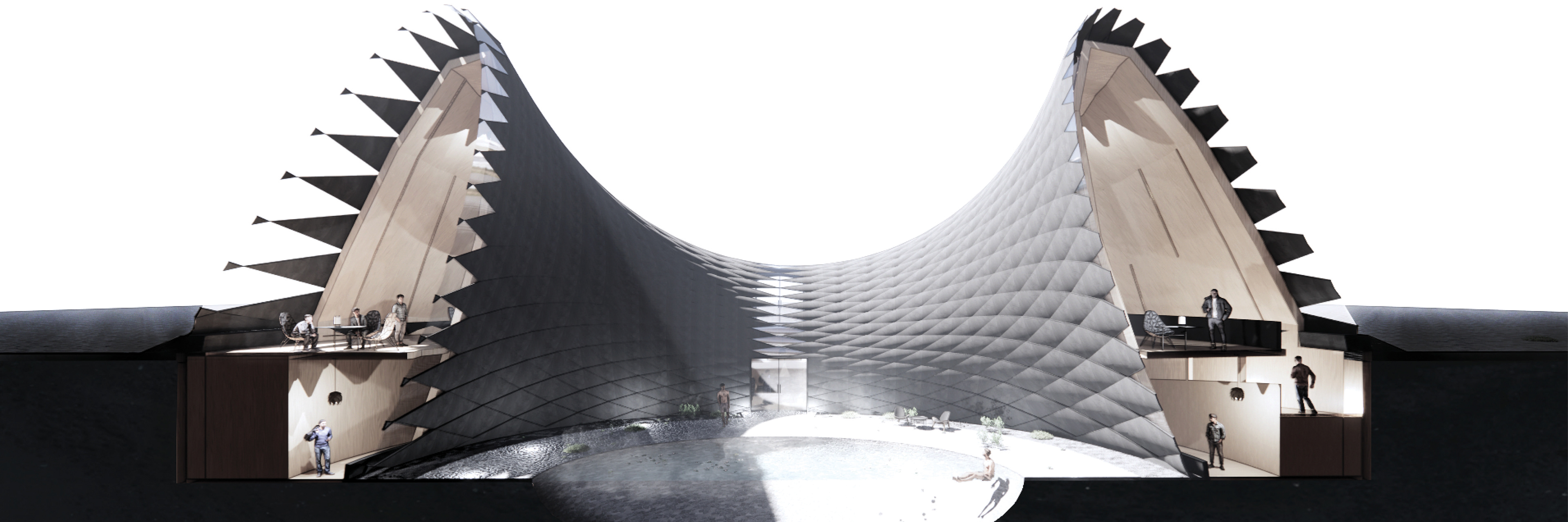 The perspective section that shows how the visitor centre works in a loop and central thermal bath