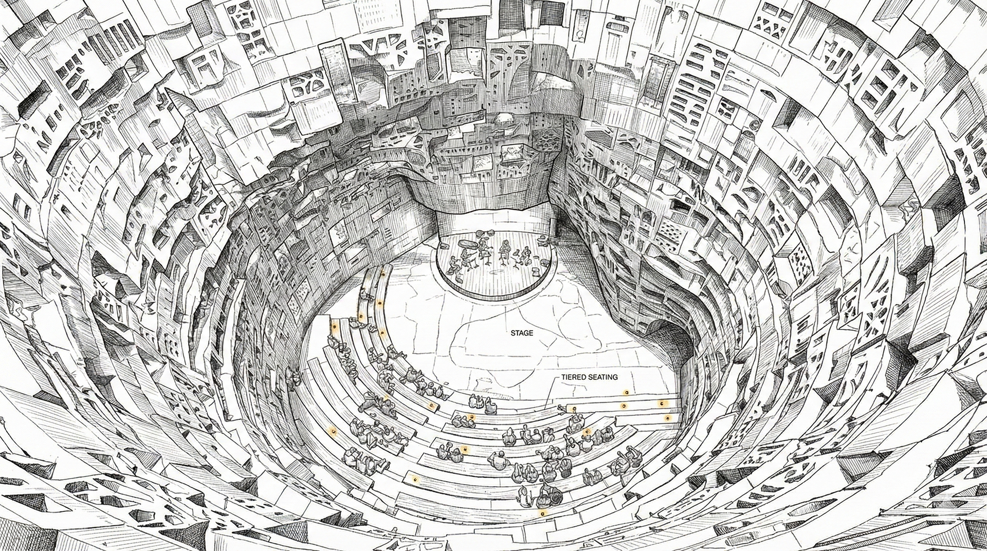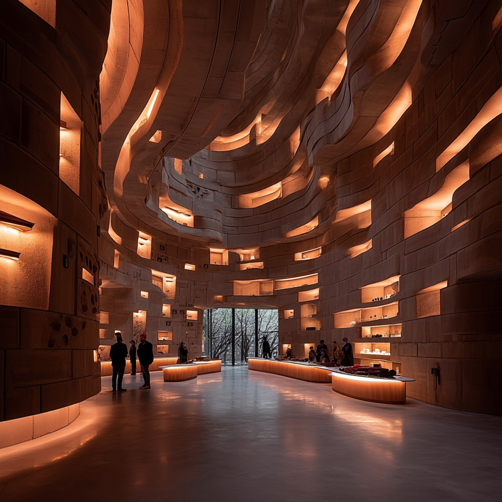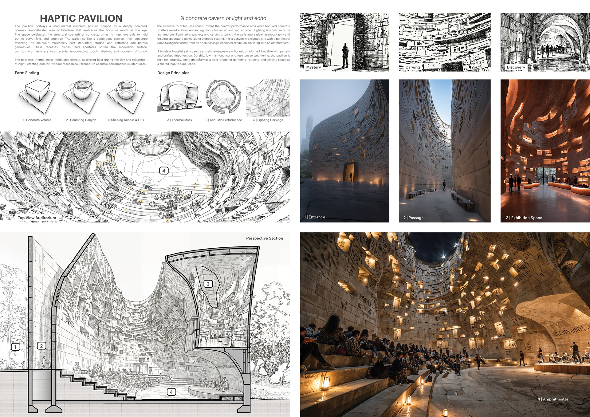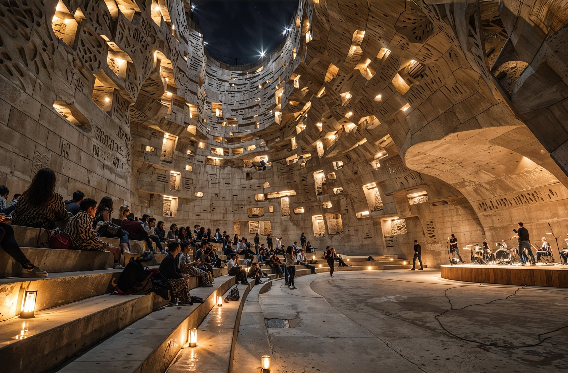 The pavilion portrays a monumental concrete pavilion shaped as a deeply sculpted, open-air amphitheater —an architecture that embraces the body as much as the eye. The space celebrates the structural strength of concrete, using its mass not only to hold but to carve, fold, and embrace. The walls rise like a continuous canyon, their curvature revealing the material’s malleability—cast, imprinted, eroded, and patterned into porous geometries. These recesses, niches, and apertures soften the monolithic surface, transforming heaviness into tactility, encouraging touch, shadow, and acoustic diffusion. The pavilion’s thermal mass moderates climate, absorbing heat during the day and releasing it at night, creating comfort without mechanical reliance. Its acoustic performance is intentional—the concave form focuses sound toward the central performance area while textured concrete scatters reverberation, enhancing clarity for music and spoken word.